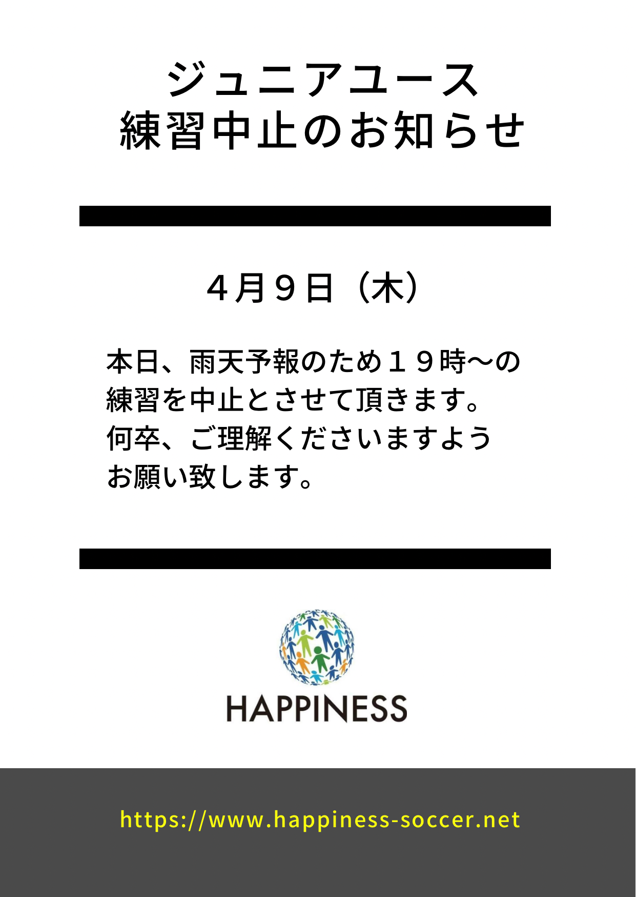 4月9日(木) ジュニアユース練習中止のお知らせ